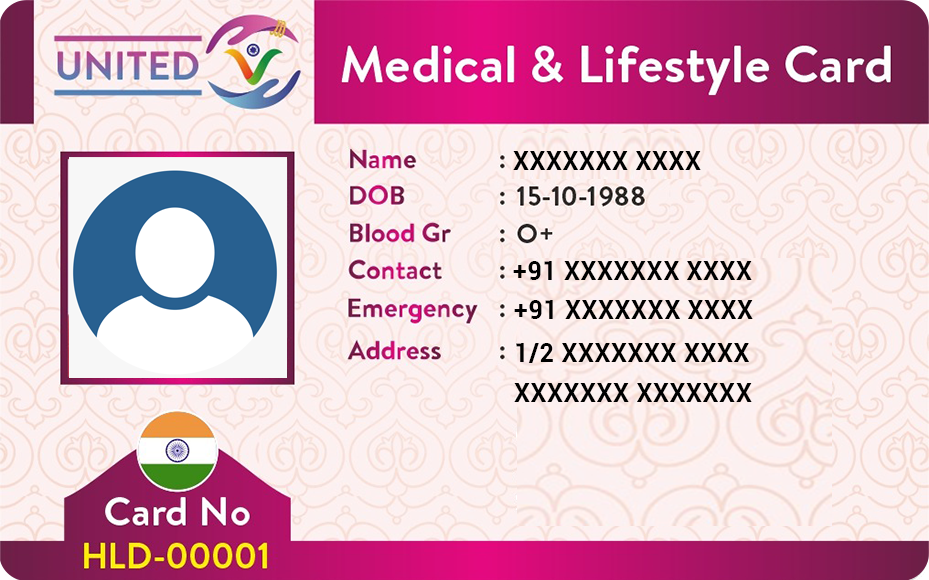 This card will contain all your vital Medical Information and statistics like Name, Address, Age, Contact Number, Representative Contact Number Family Doctor’s name with number and blood group. Useful for Health & Lifestyle discounts by vendors and healthcare providers.